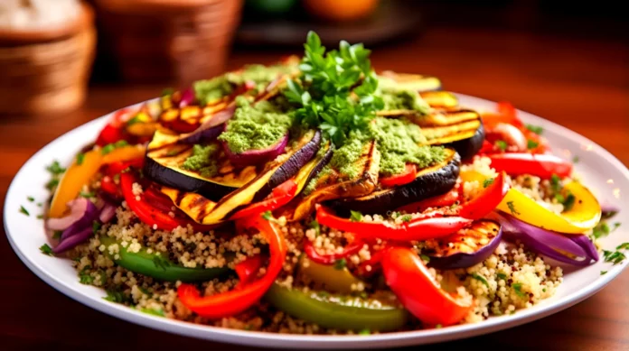 A salada de quinoa e legumes grelhados é uma obra-prima de frescor e vitalidade.
